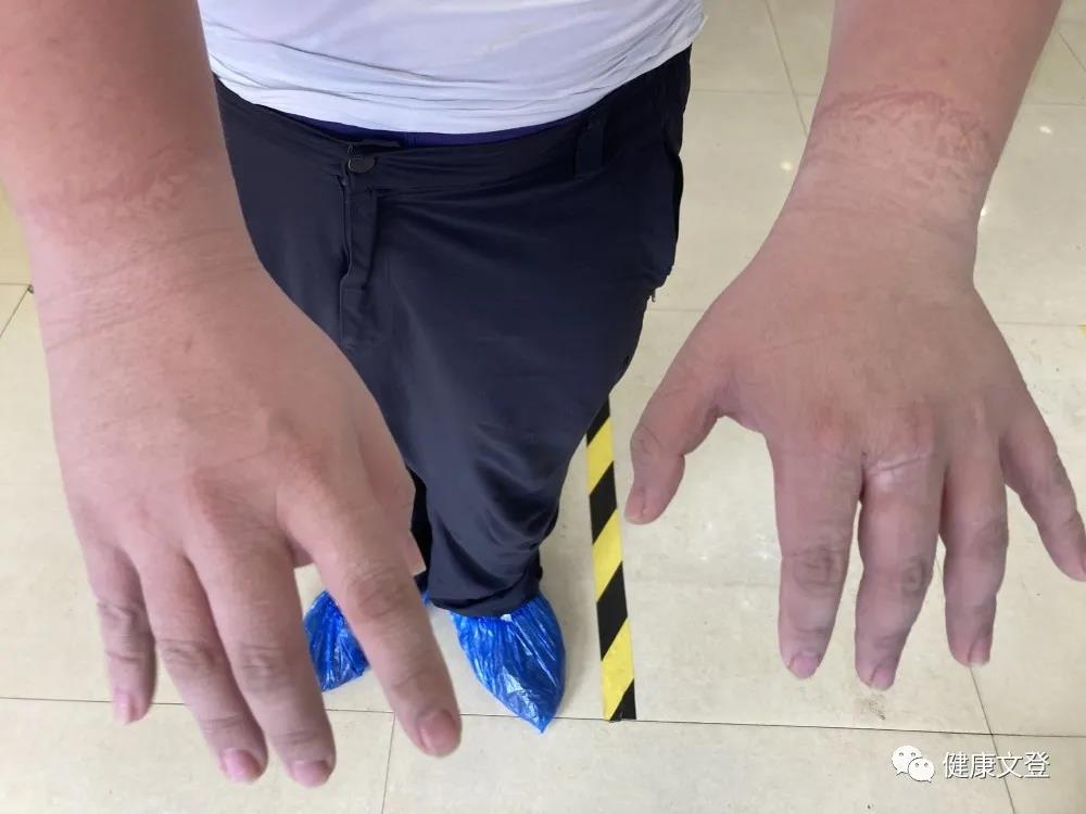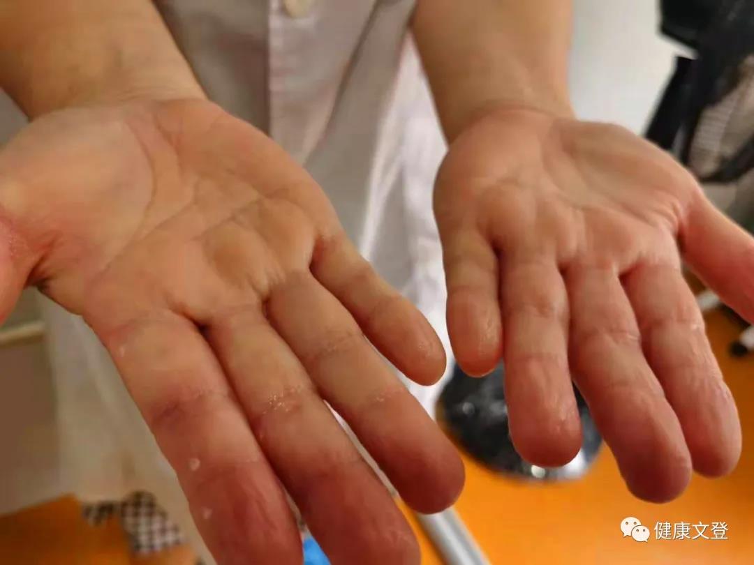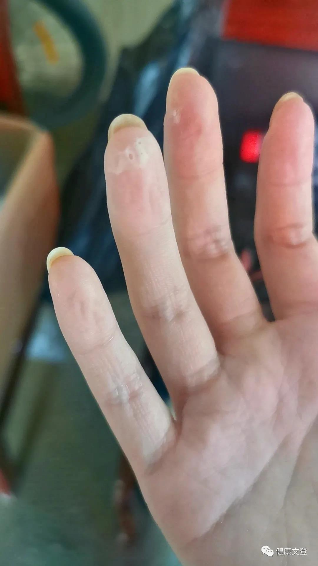 长时间佩戴橡胶手套工作,导致手指泡的发白,在拿出来的一瞬间,两只手已经不听使唤。