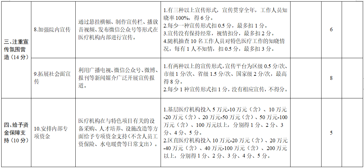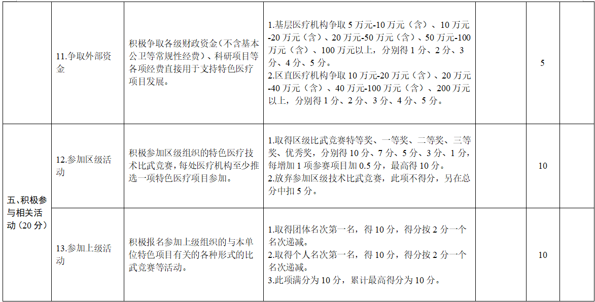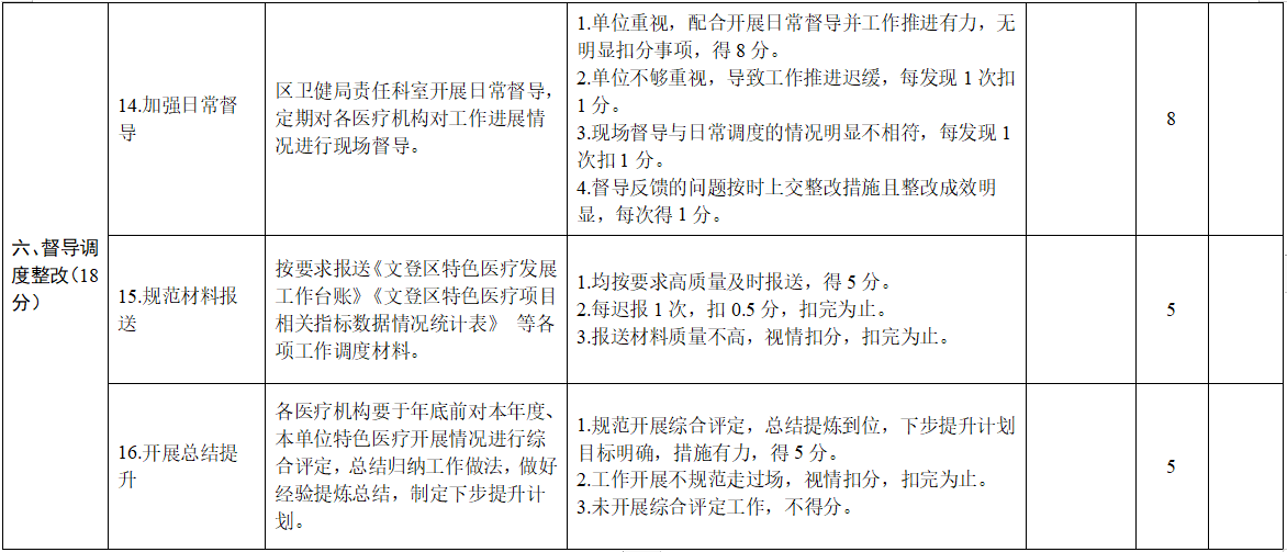 威海市文登区卫生健康局 关于印发《威海市文登区发展特色医疗提升服务质量实施方案》的通知 威文卫发〔2023〕5号 各医疗机构,局机关各科室: 现将《威海市文登区发展特色医疗提升服务质量实施方案》印发给你们,请认真贯彻落实。 威海市文登区卫生健康局 2023年3月16日 威海市文登区发展特色医疗提升服务质量实施方案 为提升特色医疗服务能力,完善医疗卫生服务体系,推进分级诊疗制度建设,深化医药卫生体制改革,满足人民群众医疗卫生服务需求,推动卫生健康事业高质量发展,特制定本工作方案。 一、工作目标 按照“提升现有特色、培育新精特色”的思路,开展“特色医疗发展年”活动,以发展特色专科、特色技术为目标,明确差异化发展思路,实现“一院一特色”,打造医疗机构发展特色鲜明、优势互补的医疗资源新布局,稳步提升区域整体医疗技术水平和服务能力。 二、实施范围 各区直医院、镇卫生院、社区卫生服务中心纳入2023年特色医疗发展实施范围。各社区卫生服务站和纳入“一体化”管理的村卫生室,由社区卫生服务中心和各镇卫生院根据各自工作实际,针对性发展特色医疗,不做区级统一要求。 三、工作安排 (一)组建专家库。组建区级特色诊疗技术攻坚突破、考核评估专家库(附件2),提供技术指导,对实施效果和技术比武进行评判。各医疗机构要组建多学科联合的院级技术攻坚专家组,明确特色项目专项技术负责人,定期组织学术讨论座谈会,研究解决特色医疗发展过程中遇到的技术难题,确保特色医疗发展推进有力。(责任科室:医政医管科、中医药科;责任单位:各医疗机构) (二)建立督导调度机制。将发展特色医疗工作列为区卫生健康局2023年日常督导调度事项,定期对工作进展情况进行现场督导和台账调度,对工作推进情况不定期进行总结通报。(责任科室:医政医管科、中医药科、基层卫生与药政科) (三)强化人才培养。将人才培养列为发展特色医疗的一项重要环节,通过选派技术骨干外出进修学习、院内新老人才传帮带、外聘专家坐诊带教等方式,加大人才培养力度。年内每处医疗机构至少选派1名相关专业技术人员至三级甲等医院进行不少于3个月的进修学习;至少外聘1名专业与本院特色医疗发展方向一致的市级以上专家进行不少于4次的坐诊带教。(责任科室:医政医管科、中医药科、政工科;责任单位:各医疗机构) (四)建立目标任务清单。各医疗机构要立足现有优势,挖掘潜力资源,进行充分的调研、讨论、评估,合理确定本单位的特色医疗发展方向。要明确目标任务,指定技术项目负责人;要制定工作措施,实现目标任务清单化、实施效果标准化。(责任单位:各医疗机构) (五)组织现场观摩。计划在第二季度组织一次现场观摩活动,安排各医疗机构负责人统一前往特色医疗发展得好、群众认可度高、专家评价好的项目所在医疗机构进行现场观摩,从典型案例、技术操作、成果展示、设备设施参观等多方面,了解特色医疗发展情况,做到相互学习交流、共同促进发展。(责任科室:医政医管科、宣传教育科、办公室;责任单位:各相关医疗机构) (六)举办技术大比武活动。计划在第三季度举办一次以“精益求精创一流 工匠精神求卓越”为主题的特色诊疗技术大比武活动。各医疗机构至少推选一项特色项目参加,进行临场汇报、现场实操,由专家评委现场综合打分评判,设置特等奖、一等奖、二等奖、三等奖、优秀奖,给予颁发荣誉证书、奖品等,并纳入年终综合评定考核。(责任科室:医政医管科、中医药科、基层卫生与药政科、宣传教育科、办公室;责任单位:各医疗机构) (七)加大宣传力度。对特色医疗发展过程中出现的特色技术、典型案例、典型人物、社会影响等内容,充分利用广播电视、微信公众号、微博、报刊等新闻媒介,开展广泛的宣传报道。在医疗机构内部,要通过悬挂横幅、制作宣传栏、播放音视频等形式,全方位展开宣传;与区融媒体中心合作,录制系列特色诊疗技术宣讲推介视频,在电视、手机等平台播放,积极营造“发展特色、认识特色、接受特色”的良好社会氛围。(责任科室:宣传教育科、医政医管科、中医药科、基层卫生与药政科;责任单位:各医疗机构) (八)组织综合考评。年底组建专家组,对各医疗机构特色医疗服务项目开展情况进行综合考评、量化打分。被考评单位分区直医院(一组)、基层医疗机构(二组)两个分组,设立单位和项目两类奖项,单位奖项分为一、二、三等奖;项目奖分为特等奖、一等奖、二等奖、三等奖、优秀奖。对取得一组单位奖一、二、三等奖的医疗机构,分别给予20万、10万、5万元的资金奖励;对取得一组项目奖特等奖、一等奖、二等奖、三等奖、优秀奖的项目,分别给予8万、6万、4万、2万、1万元的资金奖励,并在有关资金分配时给予倾斜性奖励。对取得二组单位奖一、二、三等奖的医疗机构分别给予10万、8万、4万元的资金奖励;对取得二组项目奖特等奖、一等奖、二等奖、三等奖、优秀奖的项目分别给予5万、4万、3万、2万、1万元的资金奖励。(责任科室:医政医管科、中医药科、财审科;责任单位:各医疗机构) 四、工作步骤 (一)第一阶段(2023年2月)。各医疗机构要全面梳理总结各自特色发展基础优势,找准特色医疗发展定位,理清发展思路,列出目标计划,建立工作台账。要形成组