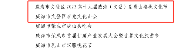 12月28日山东省文化和旅游厅公布2023年度“好客山东•乡村好时节”优秀案例入选名单,文登区2023第十九届威海(文登)昆嵛山樱桃文化节、李龙文化山会入选特色主题活动,文登区慈口观村入选乡村旅游网红打卡地。