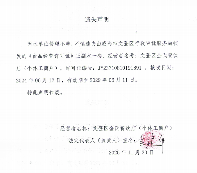 关于文登区金氏餐饮店食品经营许可证正副本的遗失声明