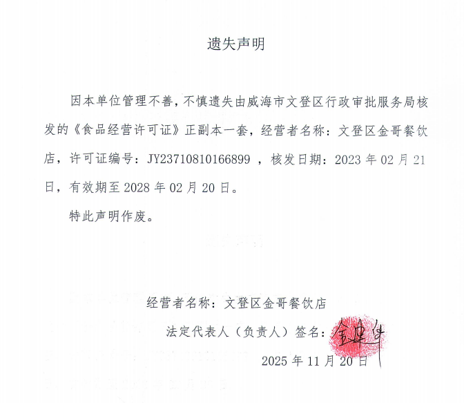 关于文登区金哥餐饮店食品经营许可证正副本的遗失声明