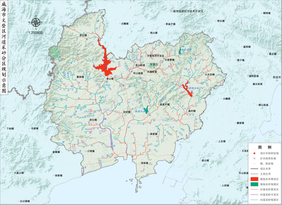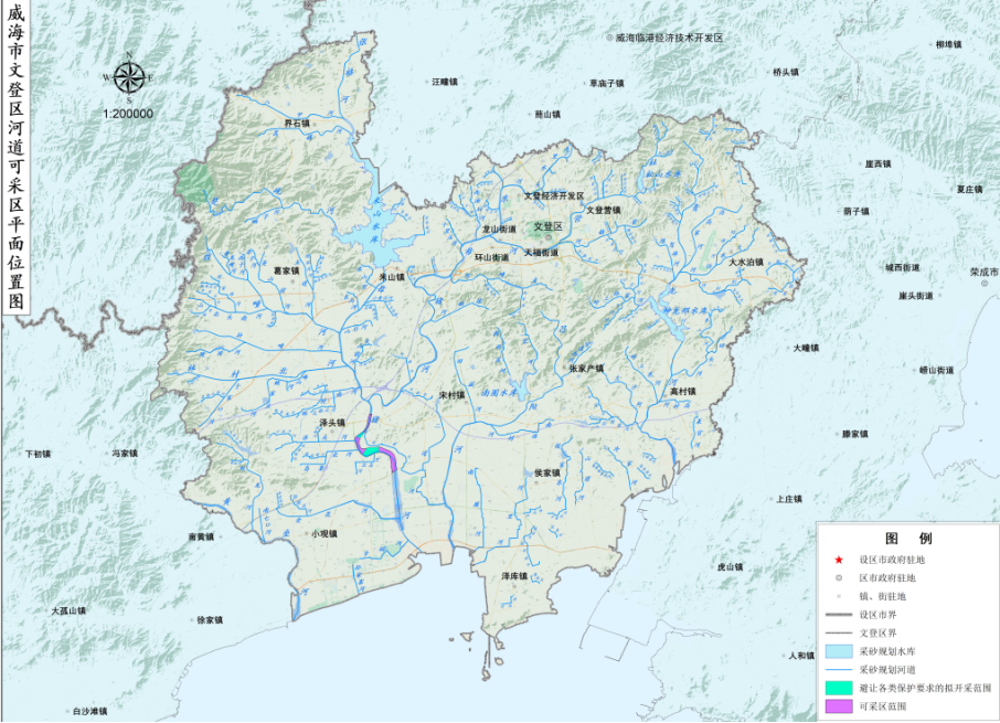 注:上表中带有*号的河道,其长度均为文登区境内的河道长度。 1.2 水文气象特性 文登区地处北温带,属东亚季风区域大陆性气候。具有季风进退频繁,四季变化分明,春季回暖晚,干燥多风,夏季湿热多雨,秋季凉爽易旱,冬季漫长寒冷多雪等特点。全区多年平均气温11.5℃,极端最高气温36.4℃,极端最低气温-25.5℃。域内多年平均降水量803.6mm,降雨量多集中在7、8、9三个月。年均无霜期194天,平均日照2540.7小时,日照率为57%。全年相对湿度为71.5%,历年主导风向,夏季为东南风,冬季为西北风,平均风速4~5m/s,水汽来源主要来自东南季风带来的大量水汽。 全区河流均为雨源型河流,多为季节性间歇河流。枯水季节,除几条主要河流中下游有很小径流外,大都干涸断流。一降暴雨,则洪水汹涌。其特点是:源高、流短、涨快、退速。 1.3 水生态环境现状 1.3.1 水功能区划 根据《威海市文登区水功能区划》,文登区共划分一级水功能区3个,二级水功能区14个,其中母猪河流域水功能一级区划均为开发利用区,水功能二级区划共划出4个饮用水源区,3个工业用水区,3个农业用水区;青龙河流域水功能一级区划均为开发利用区,水功能二级区划共划出1个饮用水源区,1个农业用水区;昌阳河流域水功能一级区划均为开发利用区,水功能二级区划共划出1个饮用水源区,1个农业用水区。 1.3.2 水质状况 威海市生态环境局对威海市各水功能区水质实行月监测,采用双参数法对水质进行评价,对于COD大于30mg/L的水域选用COD指数,对于COD小于或等于30mg/L的水域选用高锰酸盐指数。 根据《威海市2024年生态环境质量公报》(威海市生态环境局,2025.06),威海市13条重点河流水质达标率100%,其中12条水质优于或达到国家《地表水环境质量标准》(GB 3838-2002)Ⅲ类标准,占92.3%,无劣Ⅴ类河流。 威海市12个主要饮用水水源地水质继续保持优良状态,其中米山水库、坤龙邢水库水源地水质均达到或优于国家《地表水环境质量标准》(GB 3838-2002)Ⅲ类标准,水质达标率为100%。 1.4 河道(航道)整治工程现状与近期规划 1.4.1 河道整治工程概况 根据《山东省水利厅关于文登市母猪河米山水库~鸭子夼段治理工程初步设计的批复》(鲁水许字〔2013〕346号)、《关于文登市青龙河下游段治理工程初步设计的批复》(鲁水发规字〔2011〕119号)、《山东省水利厅关于文登市昌阳河治理工程初步设计的批复》(鲁水发规字〔2012〕2025号)、《威海市行政审批服务局关于东母猪河文登段(一期)治理工程初步设计的批复》(威审服水〔2021〕5号)等相关文件,文登区境内的区级河道已基本完成治理。 1.4.2 河道整治工程近期规划 根据威海市及文登区“十五五”水利相关规划,十五五期间文登区拟在区级河道及相关水库实施米山水库改扩建工程、坤龙邢水库增容工程(二期)、青龙河治理工程、昌阳河治理工程、山洪沟综合治理工程、米山水库流域水系整修及拦蓄调水工程,在镇级河道及相关水库实施松山水库改扩建工程、新建冷家水库工程,在村级河道实施石家河文登区段治理工程、新建西铺头水库工程、农村水系综合整治工程,主要进行河道清淤疏浚、边坡修整、险工段护砌、跨河建筑物整修,开展河流水系防护带建设,实施生态防护带建设,建立生态防护体系,实施水库库区清淤及抬田增容,总投资约23.30亿元。 为缓解水资源供需矛盾、保障供水安全、促进经济社会发展,威海市规划在青龙河下游兴建大(2)型水库——长会口水库,规划总库容11280万m3,兴利库容6722万m3。长会口水库建成后,可拦蓄地表径流,缓解当地供水紧张;调蓄南水北调二期客水;为城市生活及工业供水,兼顾灌溉周边农田;改善水库上游青龙河河道生态环境,并为下游生态补水创造有利条件。水库主要供水任务为:城镇供水、农业灌溉及下游生态补水等。 1.4.3 航道整治工程现状与近期规划 本次规划河道目前没有通航要求。 2 采砂现状及形势 2.1 社会经济概况及发展趋势 根据《2024年文登区国民经济和社会发展统计公报》,至2024年末,文登区下辖12个镇、3个街道,666个村、52个社区,全区常住人口54.72万人,常住人口城镇化率62.61%;户籍人口自然增长率-8.16‰。 初步核算,2024年文登区生产总值642.83亿元,按可比价格计算,比上年增长5.3%。其中,第一产业增加值78.4亿元,增长4.1%;第二产业增加值220.48亿元,增长6.8%;第三产业增加值343.95亿元,增长4.6%;三次产业结构为12.2:34.3:53.5。 全年实现农林牧渔业增加值86.74亿元,增长4.3%。其中,农林牧渔专业及辅助性活动增加值8.34亿元,增长5.5%。 全年规模以上工业增加值增长5.6%。分门类看,规模以上采矿业增加值下降9.8%,制造业增加值增长4.5%,电力、热力、燃气及水生产和供应业增加值增长19.3%。 三产成为全区经济的第一主导产业。全年实现服务业增加值343.95亿元,增长4.6%;占地区生产总值的比重为53.5%,对经济增长的贡献率为47.4%。规模以上服务业营业收入增长5.2%,其中,文化体育和娱乐业增长35.9%,居民服务修理和其他服务业增长16.2%,多式联运和运输代理业增长13.5%。 2.2 河道采砂现状、规划编制及实施情况 2.2.1 河道采砂现状 文登区河道砂石资源较为丰富,中下游河道砂石储量较多,且砂石质量好。2011年以前,由于城镇建设、交通道路建设等基础设施建设速度较缓,建筑市场需求的砂石量较少,河道砂石主要作为城乡基础设施建设及群众新建房屋所用的