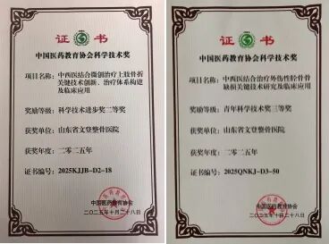 山东省文登整骨医院捷报频传:副院长王飞带领的科研团队凭借扎实的临床应用研究成果,成功斩获科学技术进步奖二等奖;骨手显微外科(二)副主任谭新欢团队依托创新性应用研究,荣获青年科学技术奖三等奖。