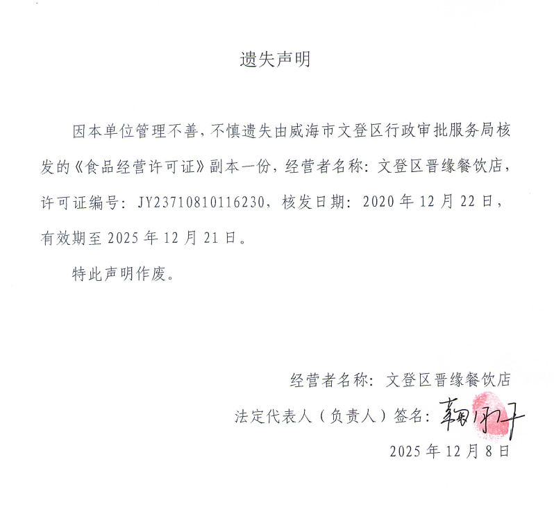 关于文登区晋缘餐饮店食品经营许可证副本的遗失声明