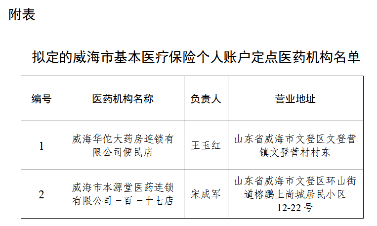 根据《医疗机构医疗保障定点管理暂行办法》(国家医疗保障局令第2号)、《零售药店医疗保障定点管理暂行办法》(国家医疗保障局令第3号)、《医药机构医疗保障协议管理经办规程(试行)》(医保办发〔2024〕33号)和威海市医疗保险事业中心《威海市新增医疗保障定点零售药店 “双通道”定点零售药店 门诊统筹定点零售药店经办流程(试行)》《威海市新增医疗保障定点医疗机构经办流程(试行)》(威医保中心发〔2024〕9号)的有关规定,经评估,拟确定,威海华佗大药房连锁有限公司便民店、威海市本源堂医药连锁有限公司一百一十七店为威海市基本医疗保险个人账户定点医药机构(见附表),现予以公示。公示时间为2025年2月18日至2025年2月22日。