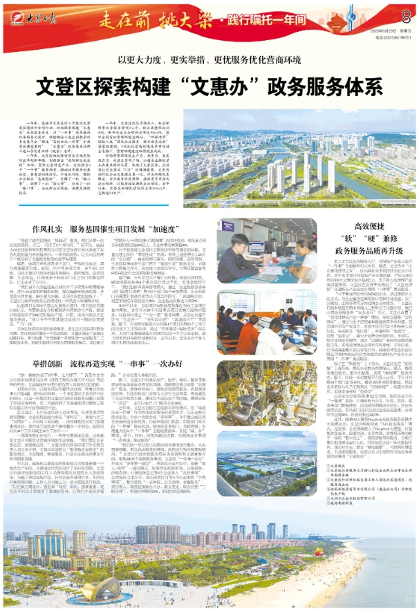 一年来,威海市文登区深入开展优化营商环境提升专项行动,积极探索构建“文惠办”政务服务体系,以“一件事”改革撬动政务服务大提升,经验做法入选全国数字政务发展年会“推进‘高效办成一件事’扩面质效典型案例”,“文惠办”政务服务品牌入选山东优质品牌(服务)名单。 一年来,文登区积极探索符合当地实际的改革创新举措,创新推出“我陪群众走流程”活动,聚焦文登特色产业,定向推出9个“一件事”服务场景,推动政务服务由基础型、普惠型向精准化、个性化升级。围绕企业群众“急难愁盼”,化解了一批“操心事”,破解了一批“烦心事”,办成了一批“暖心事”,企业群众获得感、满意度持续提高。 一年来,文登区优化市场准入、社会保障等政务服务事项255个,群众满意率达到99%,新开办企业全程网办率达到100%,获评全国首批营商环境监测站,“四张清单”经验入选“强化企业服务 提升减负成效”国家级案例,4项优化营商环境改革事项被全省推广,营商环境建设取得明显成效。 好的营商环境是生产力、竞争力,更是吸引力。走进文登学广场,20面企业旗帜竖立在最显眼的位置,体现了文登区委、区政府让企业家站“C位”的满满敬意。文登区始终把企业发展摆在第一位,涉企问题优先解决,涉企要素优先保障,推动更多资源向企业倾斜,以服务超值换来企业增值。去年以来,文登区新增民营经济主体10952户,总数超7.4万户。 作风扎实 服务基因催生项目发展“加速度” “得益于政府提供的‘保姆式’服务,我们从第一次洽谈到签约、开工,只用了3个月时间。”前不久,威海天润金钰新材料科技有限公司在文登经济开发区落地了复合轧辊制造与再制造项目,一系列的流程,让公司总经理许一感受到了文登政务服务的效率和速度。 据悉,该项目审批涉及多个部门,手续较为复杂,项目落地需要用地、规划、环评等多项手续、多个部门审批。为此文登区行政审批服务局牵头,组织规划、自然资源、生态环境、住建等多个相关部门成立专门的服务团队,让企业省了不少心。 “我们召开天润金钰重点项目开工手续集中联席辅导会,进行全面策划和模拟审批,提前编制审批流程图,开展技术性审查,解决重大问题,让项目快在起跑线上。”文登区行政审批服务局投资建设一科负责人欧海峰介绍。 轧辊项目是2025年度山东省重点项目,项目总投资预计10亿元,主要建设复合轧辊制造与再制造生产线,建成后将实现年产5000支轧辊的产能。目前,该项目建设正在稳步推进,“预计今年年底就能完成项目一期的投资建设。”许一说。 天润金钰项目建设的高效推进,是文登区完善项目服务保障,优化营商环境的一个生动缩影。文登区锚定工业强区战略目标,努力构建“分类施策—多维联动—定制服务”三维服务体系,创新实施项目审批全周期服务模式,通过建立“前期介入+中期支撑+后期保障”的闭环机制,实现重点项目审批时限压缩40%以上,企业办事成本降低60%。 对于新拿地工业项目工程建设审批周期长的问题,文登区建立项目“策划生成”机制,抓住土地挂牌公示20天的“空白期”,由审批部门牵头,组织住建、自然资源、生态环境等10多个部门召开“策划生成”联席会议,对建筑工程施工许可、防空地下室建设许可、工程质量监督等9项手续进行全面策划和容缺预审。 据了解,今年文登区已有汇兴纤维、坤泰生物科技、威海绣源纺织等8个重点项目受益于此,实现拿地即开工。“我们创新双清单管理模式,通过‘企业版服务清单+部门版责任清单’整合5个部门18个审批事项,企业和部门只需要盯着清单和节点开展工作即可。”欧海峰介绍,现在审批综合效能提升30%,企业跑动次数也下降50%。 2024年以来,为使项目审批制度改革红利向工业项目集中释放,文登区对85个区级重点项目实施分级培育服务,绿色项目建立“一企一策”服务档案,灵活运用施工许可“九证合一”“分阶段办理”“拿地即开工”等政策。眼下,兴文研究院动力车间等4个项目实现15个工作日内完成开工手续办理,通过“告知承诺+容缺受理”组合拳,天润工业智能制造车间项目提前一个月完成审批,创下同类项目审批时效新纪录。去年以来,全区有23个重大项目实现快速落地动工。 举措创新 流程再造实现“一串事”一次办好 “跑一趟就办成了5件事,太方便了。”谈及在文登区行政审批服务局办理《建筑工程综合施工许可证》等证件的经历,文昌福地住宅项目部负责人刘国亮记忆犹新。 刘国亮介绍,以前各项证件需单次办理,曾有过往办事大厅跑4趟,填写13份材料,一个多星期后才拿到许可证的经历。而这一次他仅到文登区行政审批服务局窗口提供了申请表等材料,第二天就收到了文昌福地项目建筑工程综合施工许可证等6类许可证。 在文登区,不少企业负责人近来发现,办理各类手续愈发顺畅:企业实现拍地与拿证“零时差”,拿地与开工“双同步”;不用线下来回跑,一次性就能把水电气报装事项办好;项目竣工验收多个事项整合一步到位,验收时间从40个工作日减至10个工作日…… 一项项举措出台实行、一件件实事落地见效,这些都是文登区不断优化营商环境的生动实践。“我们要比企业想在前、更要做在前。”文登区优化营商环境工作专班负责人刘元奎介绍,文登区牢固树立“服务跑在审批前”的服务理念,主