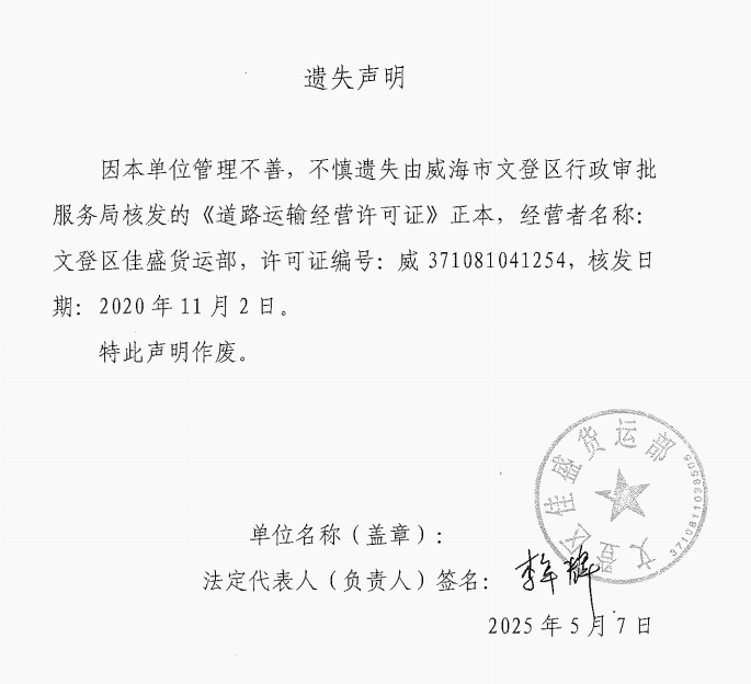 关于文登区佳盛货运部道路运输经营许可证正本的遗失声明
