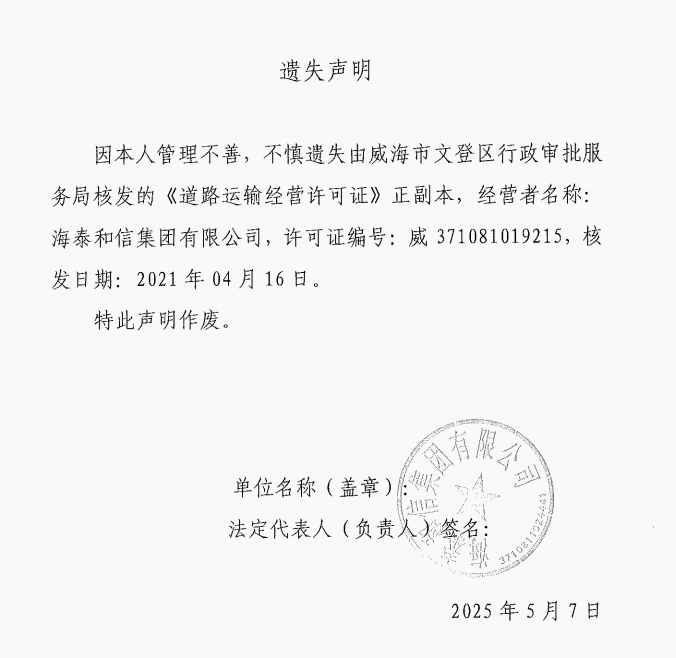 关于海泰和信集团有限公司道路运输经营许可证正副本的遗失声明