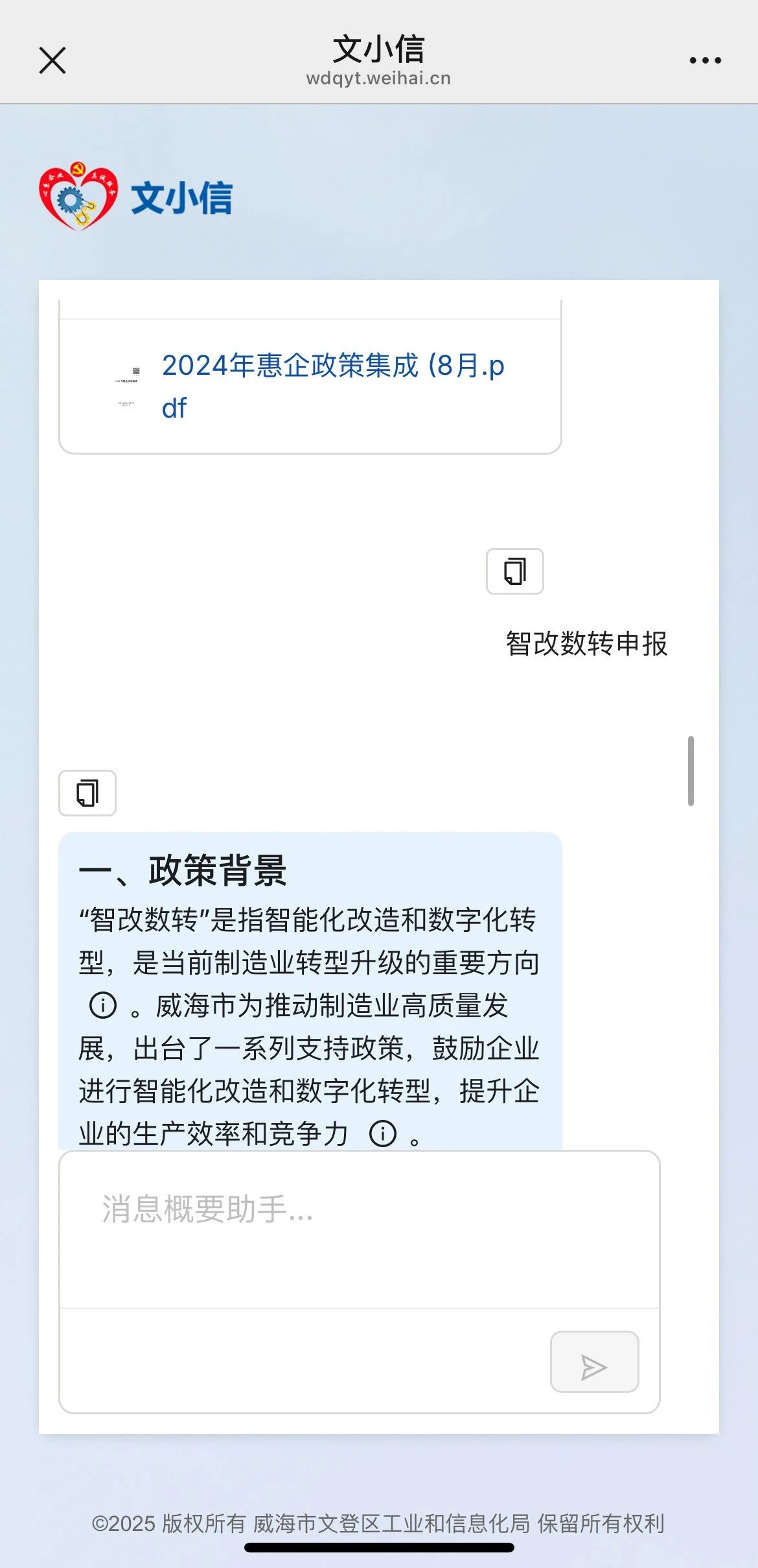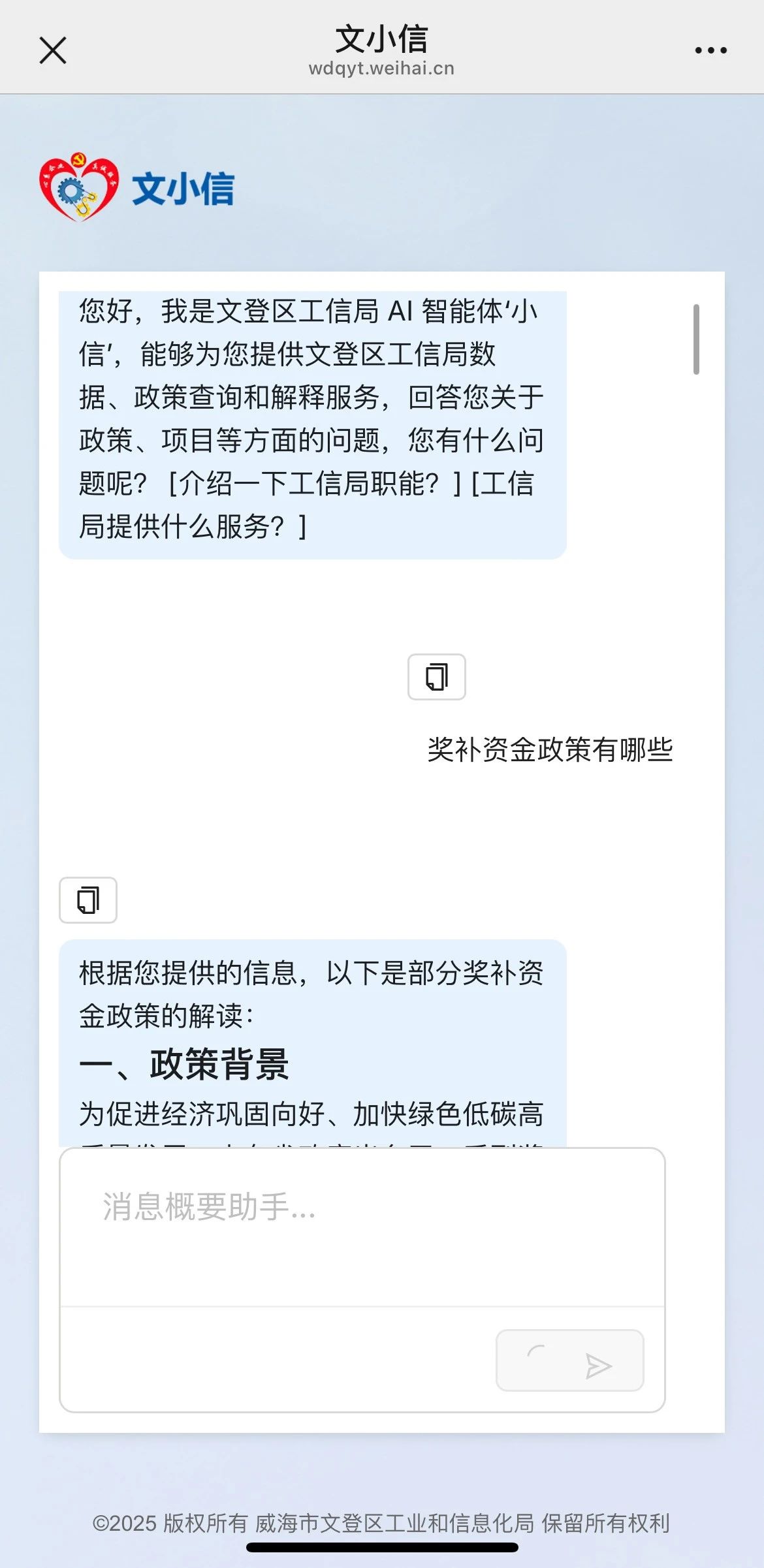 近日,由文登区工业和信息化局与威海市驰云网络科技有限公司携手打造的工信AI助手“文小信”正式上线。