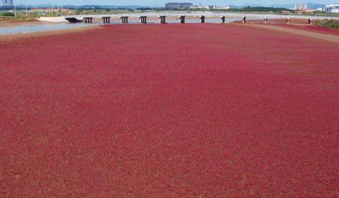 일전 문등구 남해신구 창양하입구의 붉은 해변의 잎사귀가 적홍색으로 변해 점점 가경으로 치달고있다.