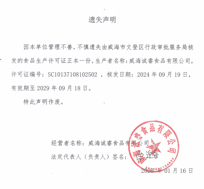 关于威海诚睿食品有限公司食品生产许可证正本的遗失声明