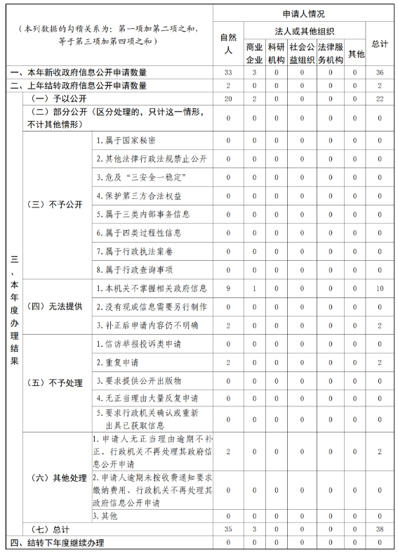 (二)依申请公开工作情况。2025年,我局规范依申请公开工作流程,高效做好依申请公开办理工作。2025年度办结公民和法人或其他组织政府信息公开申请38件,比去年减少64件。结转下年度办理0件,对收到的所有申请均按照规定认真办理并留存归档。办理结果中予以公开22件,无法提供12件,不予处理2件,其他处理2件。本年度因政府信息公开行政复议2件,结果均为责令重做,因政府信息公开引起的行政诉讼0件。