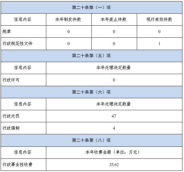 (三)政府信息管理方面。对主动公开事项目录进行维护,不断丰富公开内容,做到法定公开事项主动公开到位,其他事项审慎主动公开。严格履行信息公开“三审三校”工作机制,坚决做到敏感信息、涉密信息不上网,公民隐私信息不泄露,确保政府信息规范发布。本年度未制发或废止规范性文件,延长了1份规范性文件有效期。