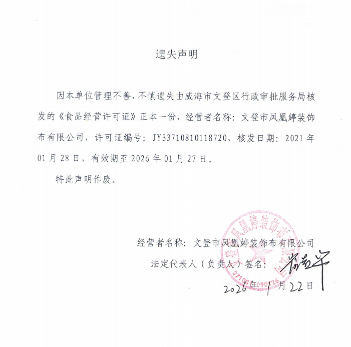 关于文登市凤凰婷装饰布有限公司食品经营许可正本的遗失声明