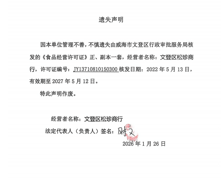 关于文登区松珍商行食品经营许可证正副本的遗失声明