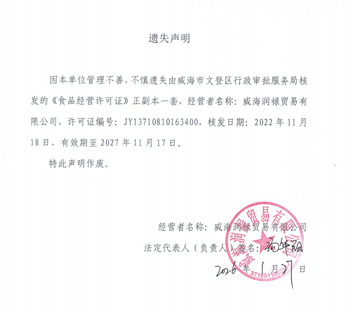 关于威海润禄贸易有限公司食品经营许可证正副本的遗失声明