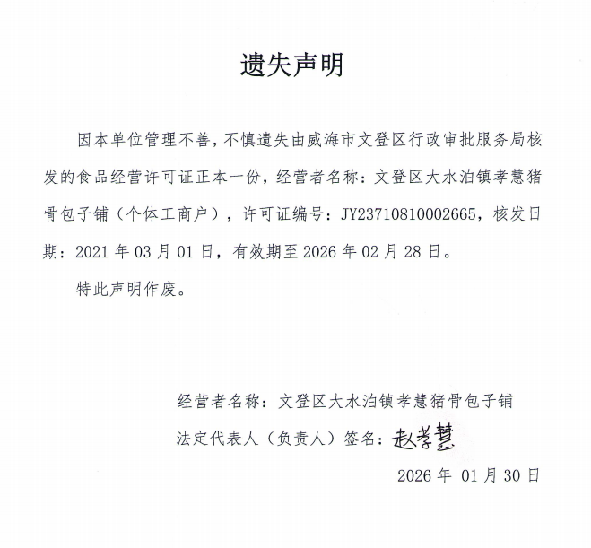 关于文登区大水泊镇孝慧猪骨包子铺食品经营许可证正本的遗失声明