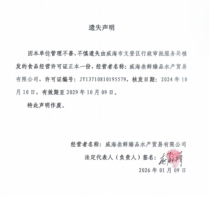 关于威海叁鲜臻品水产贸易有限公司食品经营许可证正本的遗失声明