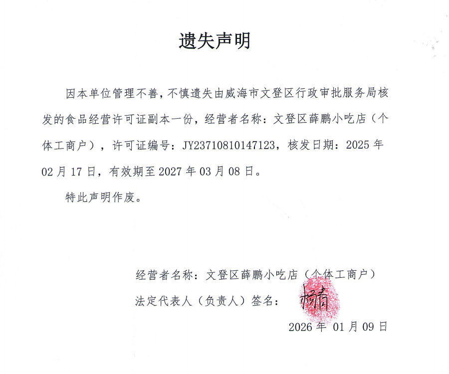 关于文登区薛鹏小吃店食品经营许可证副本的遗失声明