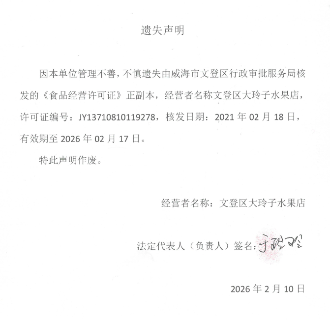 关于文登区大玲子水果店食品经营许可证正副本的遗失声明