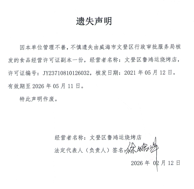 关于文登区鲁鸿运烧烤店食品经营许可证副本的遗失声明