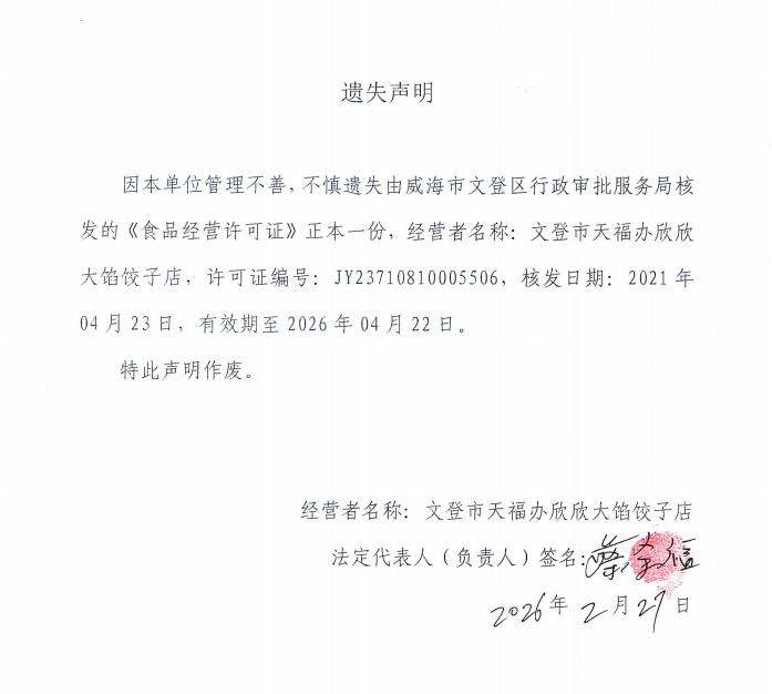 关于文登市天福办欣欣大馅饺子食品经营许可证正本的遗失声明