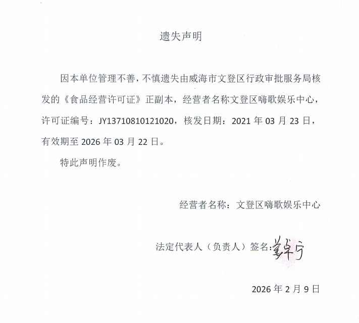 关于文登区嗨歌娱乐中心食品经营许可证正副本的遗失声明
