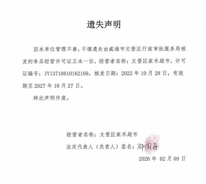 关于文登区家禾超市食品经营许可证正本的遗失声明