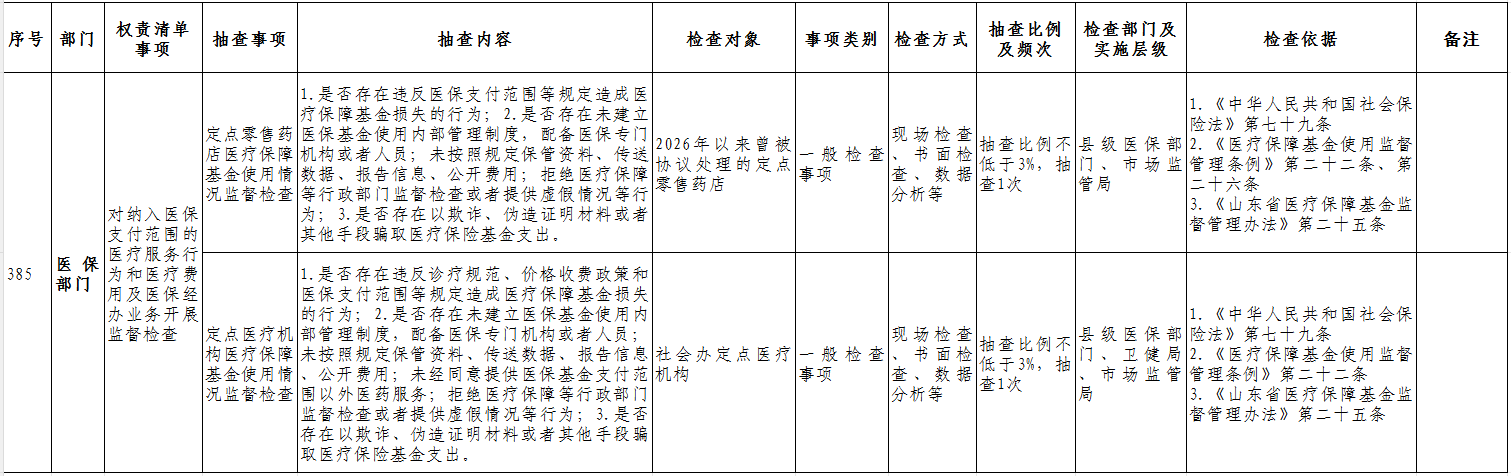 威海市文登区医疗保障局2026年度“双随机、一公开”抽查事项清单