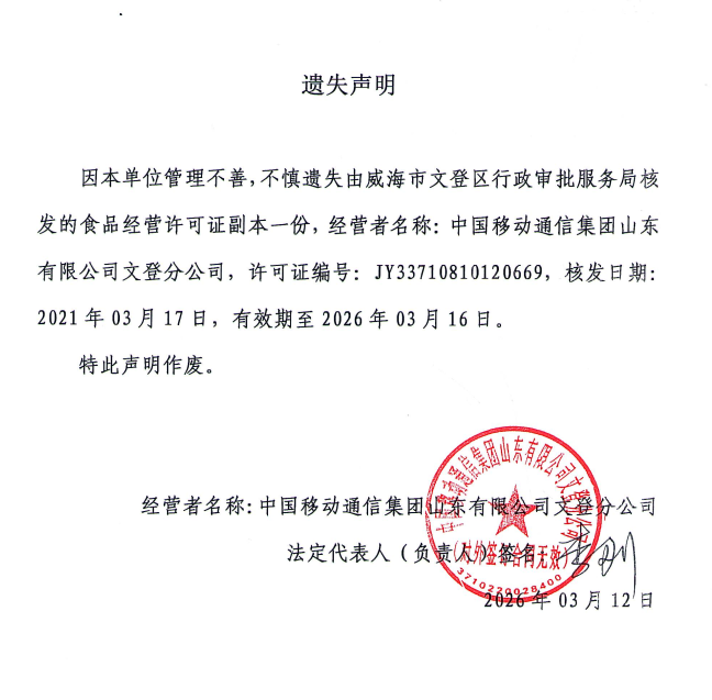 关于山东移动通信集团山东有限公司文登分公司食品经营许可证副本的遗失声明