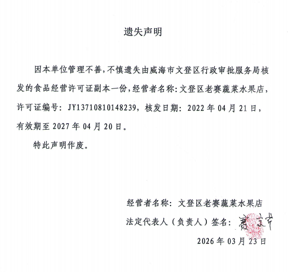 关于文登区老赛蔬菜水果店食品经营许可证副本的遗失声明