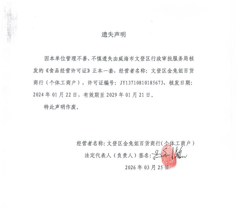 关于文登区金兔姐百货商行食品经营许可证正本的遗失声明