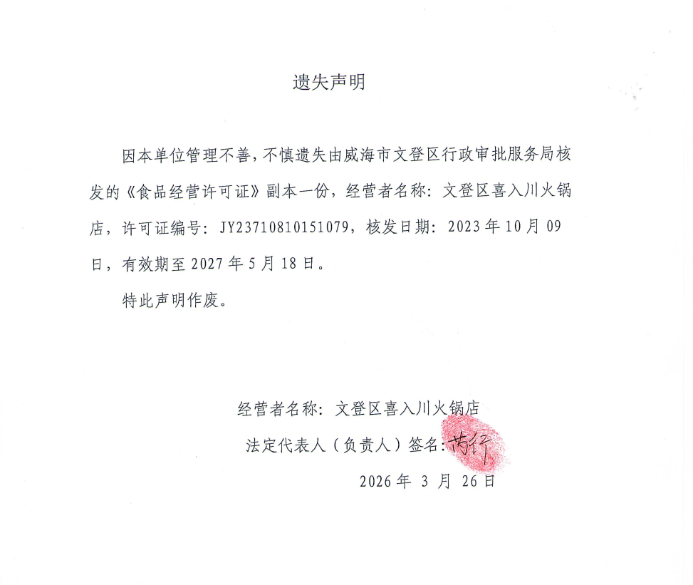 关于文登区喜入川火锅店食品经营许可证副本的遗失声明