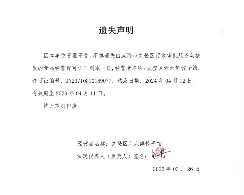 关于文登区六六鲜饺子馆食品经营许可证的遗失声明