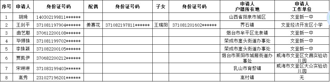 根据《威海市文登区住房保障租赁补贴实施办法》(威文住建通字[2025]7号)的规定,经过审核,下列家庭初步符合我区公共租赁住房申请条件。现将申请人名单予以公示,请社会各界监督。