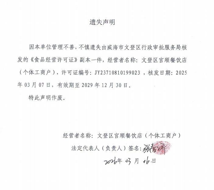 关于文登区宫顺餐饮店食品经营许可证副本的遗失声明