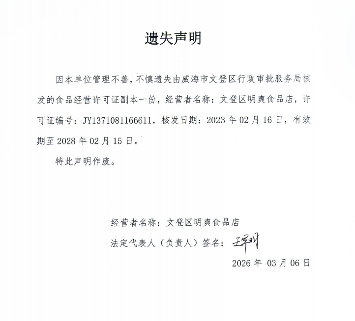 关于文登区明爽食品店食品经营许可证副本的遗失声明