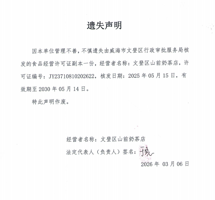 关于文登区山前奶茶店食品经营许可证副本的遗失声明