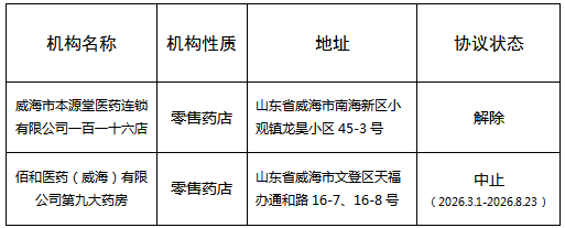 为加强我区定点医药机构协议管理,保障医保基金安全运行,根据《零售药店医疗保障定点管理暂行办法》(国家医疗保障局令第3号)、《山东省医药机构医疗保障协议管理经办规程(试行)》(鲁医保办发〔2025〕5号)、威海市医疗保障局《关于完善新增定点医药机构经办流程的通知》和威海市定点零售药店医疗保障服务协议相关条款规定,现将2026年3月份中止与解除医保服务协议的医药机构名单公布如下:
