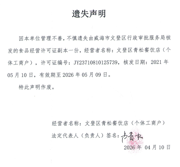 关于文登区青松餐饮店食品经营许可证副本的遗失声明