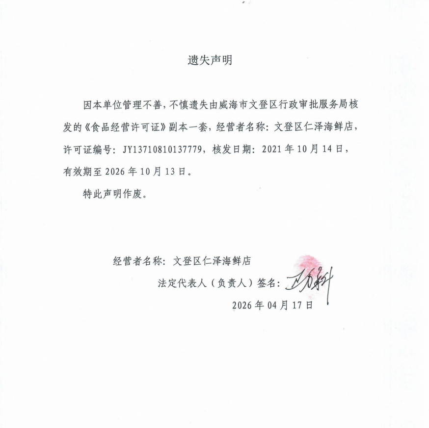 关于文登区仁泽海鲜店食品经营许可证的遗失声明