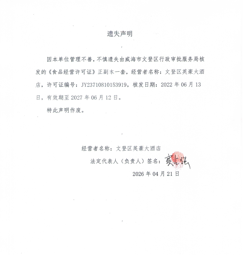关于文登区英豪大酒店食品经营许可证的遗失声明