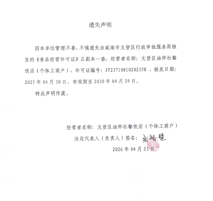 关于文登区油炸社餐饮店食品经营许可证的遗失声明
