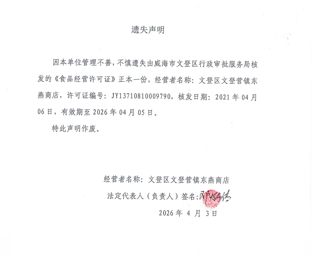关于文登区文登营镇东燕商店食品经营许可证的遗失声明