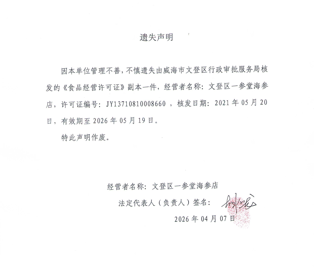 关于文登区一参堂海参店食品经营许可证的遗失声明