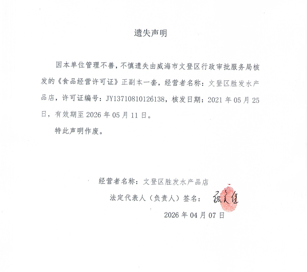 关于文登区胜发水产品店食品经营许可证的遗失声明