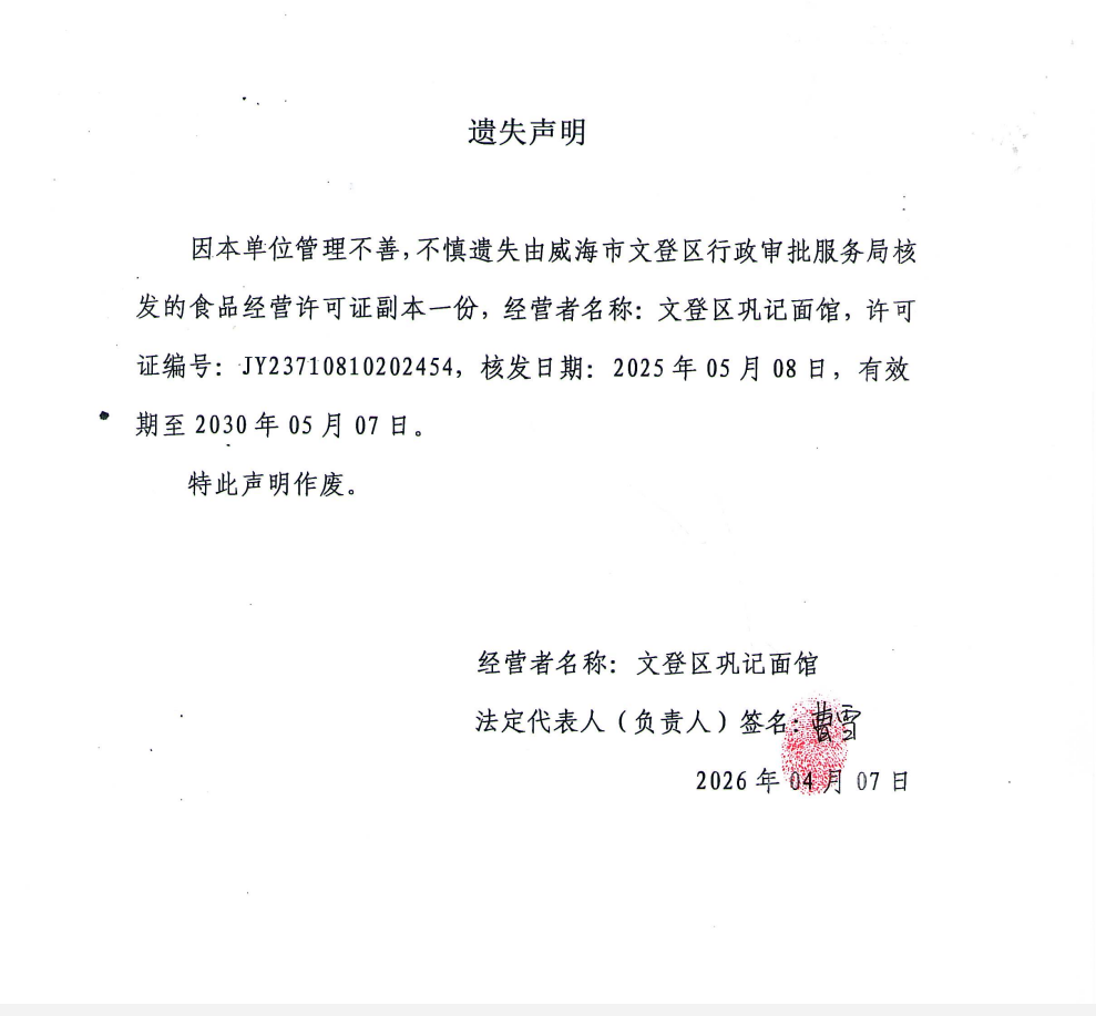 关于文登区巩记面馆食品经营许可证的遗失声明