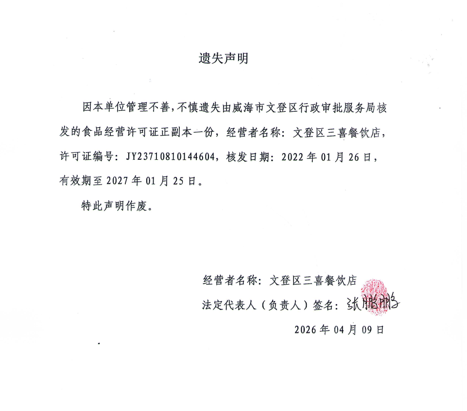 关于文登区三喜餐饮店食品经营许可证的遗失声明