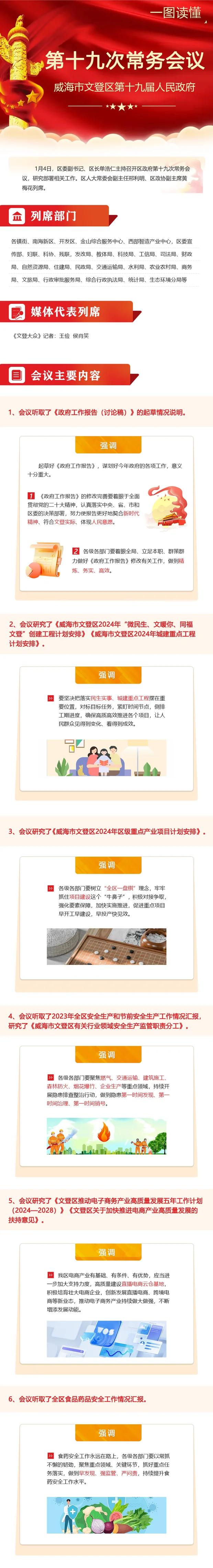 会议听取了《政府工作报告(讨论稿)》的起草情况说明。强调,起草好《政府工作报告》,谋划好今年政府的各项工作,意义十分重大。《政府工作报告》的修改完善要着眼于全面贯彻党的二十大精神,认真落实中央、省、市和区委的决策部署,努力使报告更好地契合新时代精神、符合文登实际、体现人民意愿。各级各部门要着眼全局、立足本职、群策群力做好《政府工作报告》修改有关工作,做到精炼、务实、高效。
