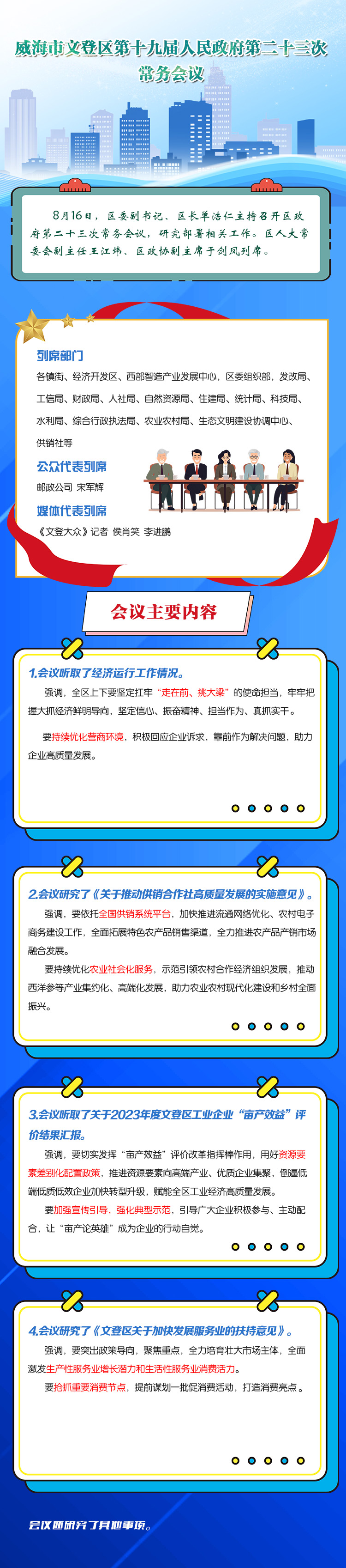 8月16日,区委副书记、区长单浩仁主持召开区政府第二十三次常务会议,研究部署相关工作。区人大常委会副主任王江炜、区政协副主席于剑凤列席。